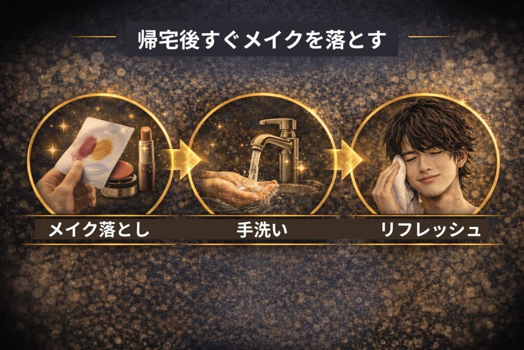 帰ったらすぐにメイクは落としてください。いつ寝てしまうかもわからないので、手を洗うのと一緒にメイクも落としてしまいましょう。タバコのヤニや汚れでぎっしりの肌はリフレッシュした方がいい。