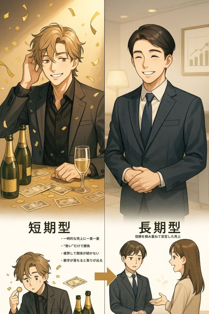 | 色恋営業 | ・恋愛トークが得意 ・駆け引きが上手な人 | ・大きく売上を伸ばしやすい ・顧客の熱量が高く支援されやすい | ・依存関係に発展しやすい ・精神的な負担が大きい |