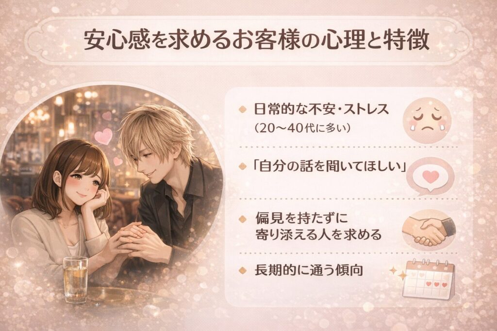 繊細で寂しがりな人は一見優しくて扱いやすい印象を与えられますが、芯の強い部分もあってコントロールするのは難しかったりもします。また気にしなくていいようなところで過剰に気にして「店に行きづらい」となったりもするのでケアが大事になってきます。